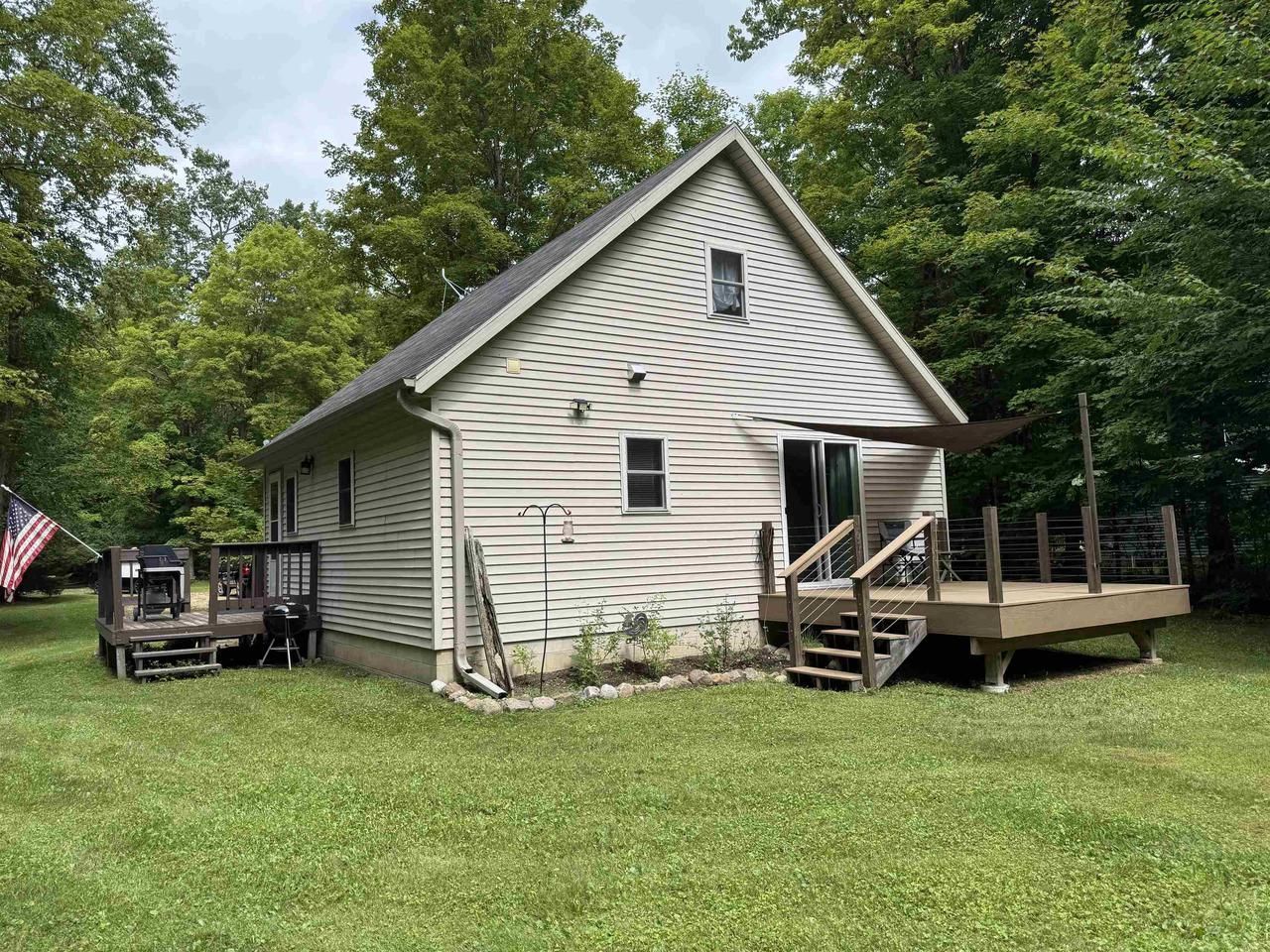 NEW PRICE! A beautiful bright gem set on 2.5 wooded acres. This 4-season home has a sun-drenched deck for enjoying the wildlife. The kitchen has hickory cabinets and an island with seating and all appliances. There is a large bathroom with storage cabinet and stackable washer/dryer. The primary bedroom is on the first floor, and a spiral staircase to the loft with bed. Includes a sofabed in the living room. The garage is newer and will accommodate all your toys. Come and enjoy the lakes (the Horn Lake boat landing is nearby)!
