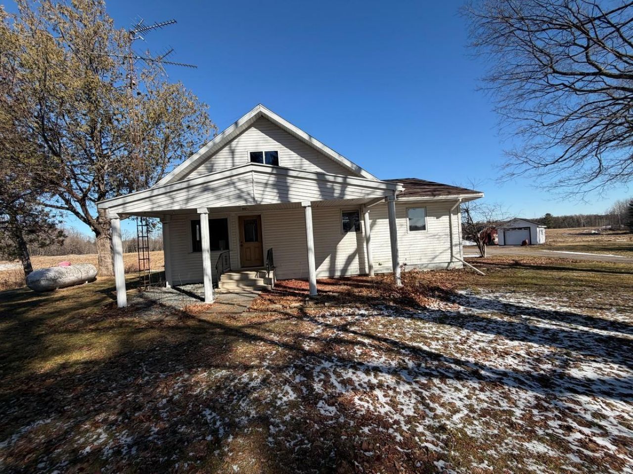 This home offers a great country location and features four bedrooms (three on the main level) and two bathrooms. The main level includes a spacious eat-in kitchen with all appliances included, a living room, a large foyer with access to both the exterior and the attached two-car garage, and a main-level laundry room. The front of the house is surrounded by a newer deck. The upper level includes a walk-through family room leading to a large bedroom. Additional features include a detached one-car garage and an extra outbuilding suitable for a chicken coop or other uses. The basement is equipped with an LP gas forced-air furnace and a wood stove, with firewood available for startup. The home is currently undergoing interior renovations and is ready for finishing touches. Most rooms require painting, and the kitchen renovation is underway and ready for your specific design ideas.