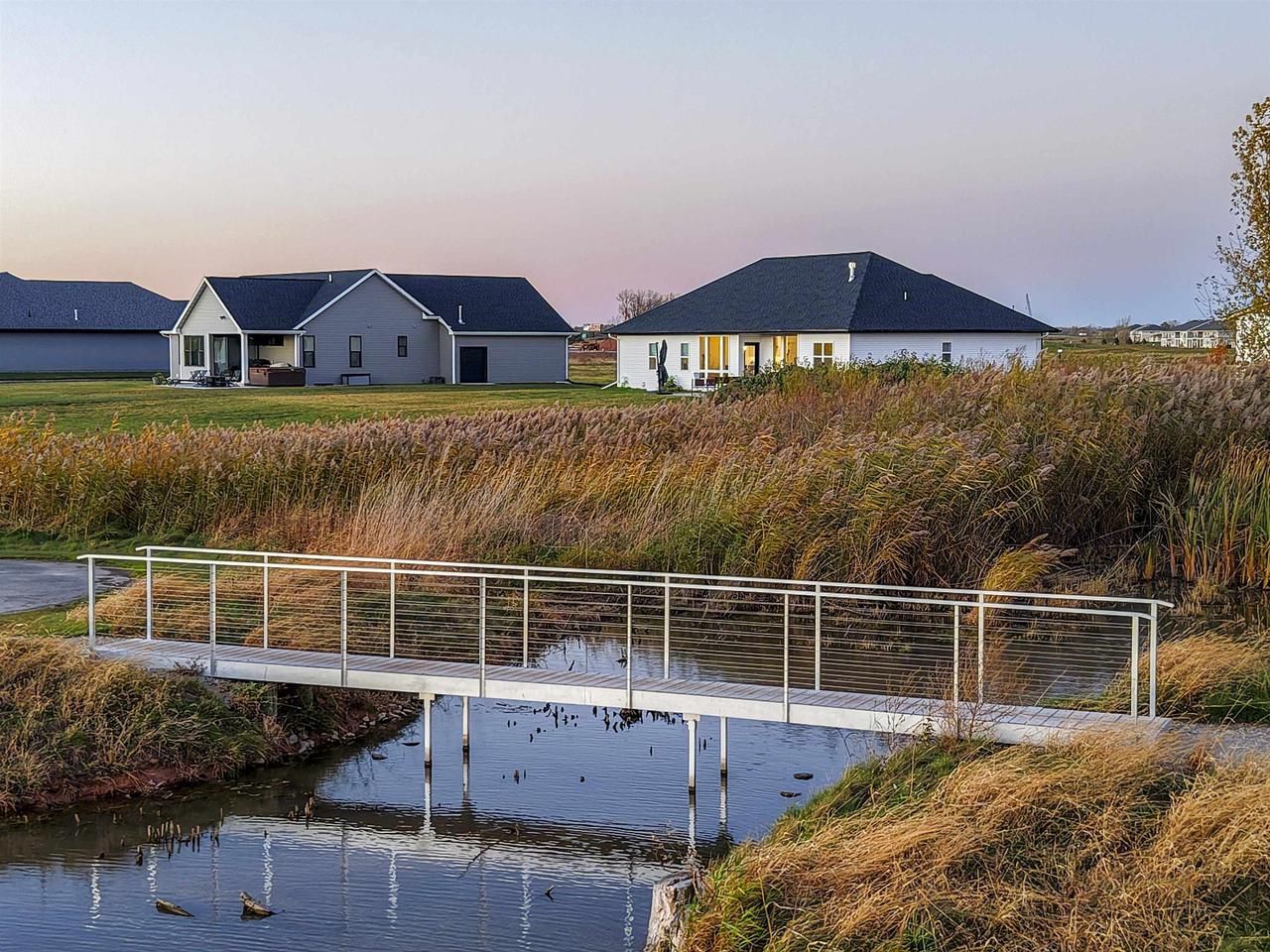 CONTEMPORARY & ELEGANT! Daily smiles delivered here thanks to breathtaking sunsets, SW exposure saturating the home w/warmth & good vibes, luxury amenities, split design ranch, .8 acre lot w/stunning GOLF COURSE views! Open concept floor plan featuring floor to ceiling stone F/P, huge butler pantry, sleek foyer, office/den/cigar room, chefs kitchen has large quartz island w/waterfall effect, sunset dining & large patio provide relaxed evenings & effortless entertaining! Primary suite w/custom walk in shower, 1st floor laundry room, powder rm/ 1/2 bath & mud room has built in locker/bench off garage. Stairs from (finished)garage to basement, LL ready to finish & plumbed for bath, wet bar, family room & additional bdrms if needed. Buyer will receive 1 yr golf membership or = credit.