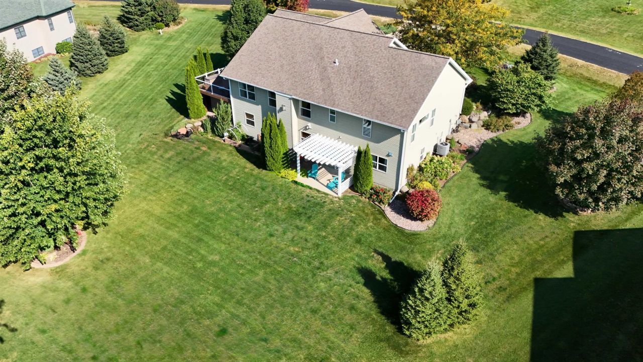 This simply charming ranch on 3/4 acre with mature trees offers nearly 2,800 sq ft, 4 bedrooms + office, 3 baths, main level laundry and 3 car garage (3rd stall extra deep for storage / workshop). Spacious kitchen & dining area with stainless steel appliances, cherry cabinets, granite countertops, breakfast bar & maple floors. Great room with soaring ceilings, huge windows and gas fireplace, cheery owners suite with walk-in closet and ensuite. Walk-out lower level offers large family room with floor to ceiling stone gas fireplace, 4th bedroom, office/flex room, 3rd bath and tons of storage. The maintenance free deck, pergola covered patio and firepit are perfect for entertaining or just enjoying your 3/4 acre meticulously maintained country lot with mature trees. This one owner ranch has been lovingly maintained and is move in ready. Recent updates include furnace (2025), central air (2025), maintenance free decking (2021).