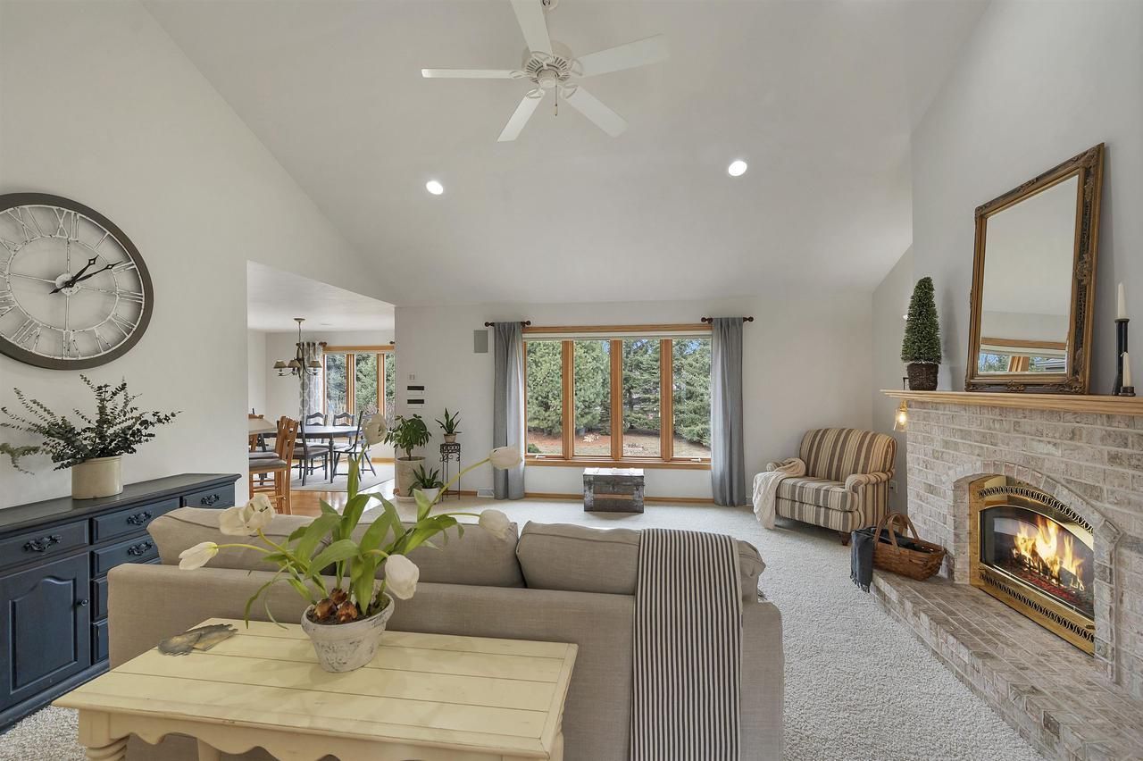 Beautiful split-bedroom ranch located in a quiet setting in Howard. Step into a spacious entryway that leads to a stunning great room featuring tall ceilings, a cozy fireplace, and large windows overlooking the backyard. The open-concept kitchen and dining area provide the perfect space for entertaining and everyday living. The spacious primary suite offers a walk-in closet and a private ensuite bathroom. The finished lower level includes a rec room, office space, and a full bathroom, providing plenty of additional living space. Enjoy the back patio with views of mature evergreens that create a private retreat. The oversized three-stall garage features an extra-deep third stall, ideal for additional storage or workspace. Lower Level SQFT from Matterport.