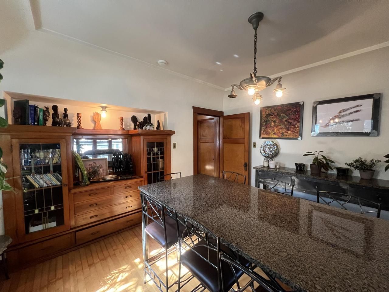 Beautiful 3 bedroom 2 full bath single family home located in a desirable and quiet neighborhood. 1st floor offers living room/dining room combo with old world charm w/ gleaming hardwood floors, built-in china buffet, updated kitchen w/ mission style cabinets, granite counters, walk in pantry & 2 spacious bedrooms. Fully finished upper level perfect for a mother in law suite w/ living/kitchen combo area, full bathroom, large bedroom with gas fireplace, vaulted ceilings & 2 walk in closets. Lower level offers cozy lounge area with a giant aquarium and a large gym area with weight set included! Home offers ''3 garages'', 5 driveway parking spaces! Two garages have electrical panels & one has 220 outlets! Perfect for a small business that needs extra storage. A must see!!