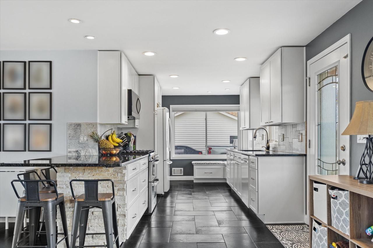 Well-maintained mid-century ranch home on a spacious lot in Greenfield. Bright living room with large picture windows and natural fireplace opens to an updated kitchen featuring granite countertops, and soft-close cabinetry. Three main-level bedrooms and a full bath provide convenient one-level living. The finished lower level adds a large rec room, second fireplace, and additional full bathroom. Updates include newer furnace (2020), windows (2013), and radon mitigation system. Enjoy your own personal park with a fully fenced backyard with mature trees and patio. Heated and cooled attached garage with 240V power and storage shed offer excellent functionality.
