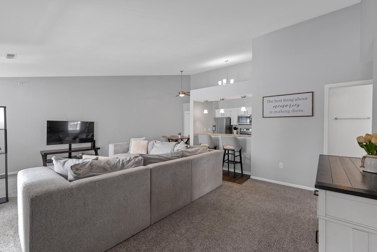 Welcome home to this tastefully updated 2 bedroom, 2 bathroom second story condo in the heart of Franklin. Enter through the private, attached garage and enjoy the bright and spacious great room with vaulted ceilings. The open-concept layout featuring an eat-in kitchen with newer granite countertops and breakfast bar is perfect for entertaining. Savor your morning coffee on the balcony that's right off of the great room. The large primary bedroom with ensuite and walk-in closet along with a roomy second bedroom and full bath that houses your in-unit laundry round out this fantastic condo. Just minutes from shopping, resaurants and parks makes this the perfect central location. This move-in ready condo is ready for its next owner!