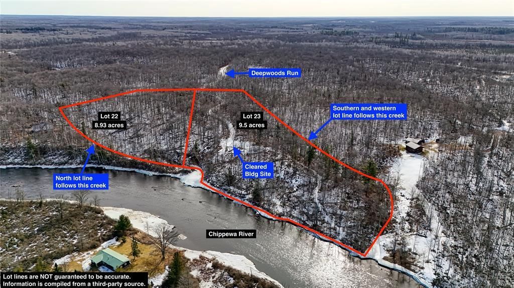 Two residential/recreational lots (Lots 22 & 23) totaling 18.43 acres of rolling, wooded land with approximately 545 feet of frontage on the Chippewa River in the Town of Ojibwa, WI. Ideally located south of the Chippewa Flowage Dam and north of the Radisson Flowage, this property sits at the end of a private road offering exceptional privacy and a peaceful Northwoods setting. An improved driveway leads to a cleared building site on Lot 23 with electric already run to the site (currently not activated). The elevated building site provides scenic north-facing views overlooking the river, with a walking path along the western edge of the lot leading down to the water. The property is uniquely framed by water features, with a creek forming the northern boundary of Lot 22 and continuing along the western and southern boundaries of Lot 23, while the northern boundary of Lot 23 fronts the Chippewa River. With established access, a prepared building location, and a mix of river and creek frontage, this property is well suited for a private home, cabin retreat, or recreational basecamp in the Northwoods.